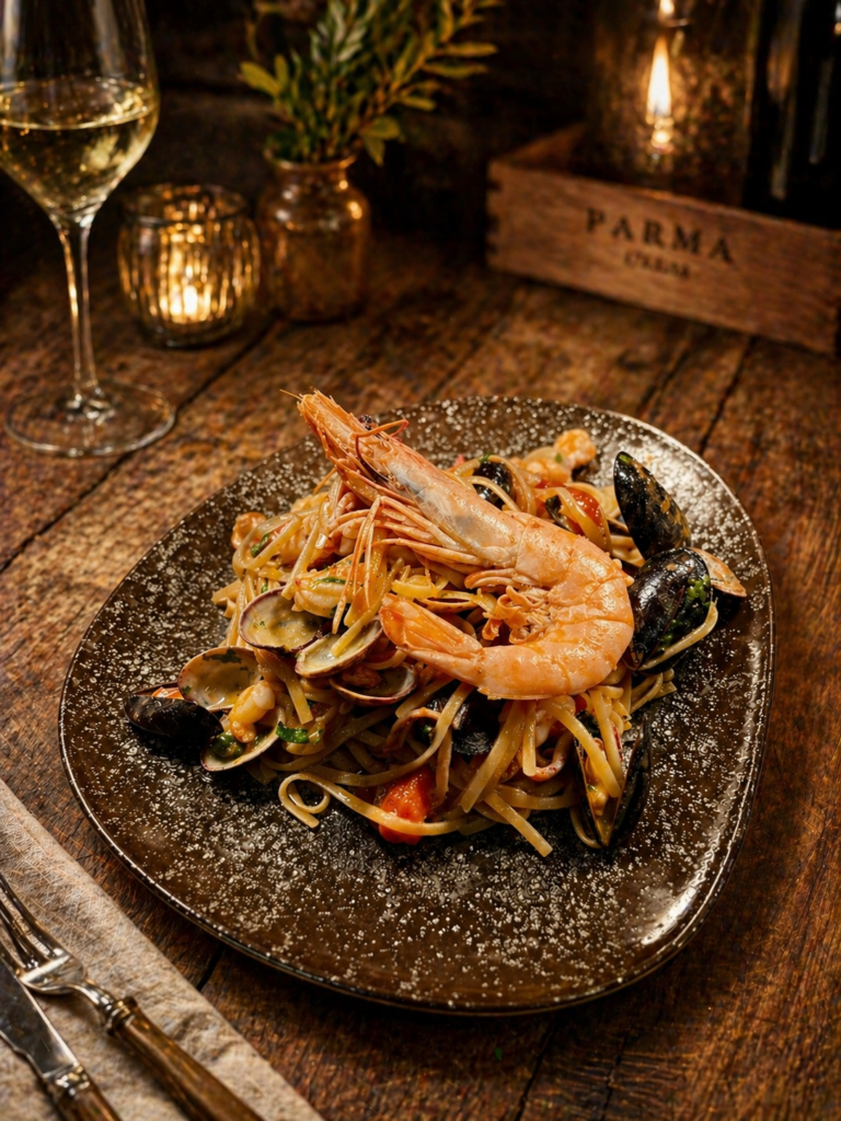 Prosciutto from Langhirano, aged in the mountain air. Parmigiano Reggiano from the cooperatives of Reggio Emilia. Balsamico invecchiato from Modena. Lambrusco from the plains. It is a short list, kept honest, poured generously.